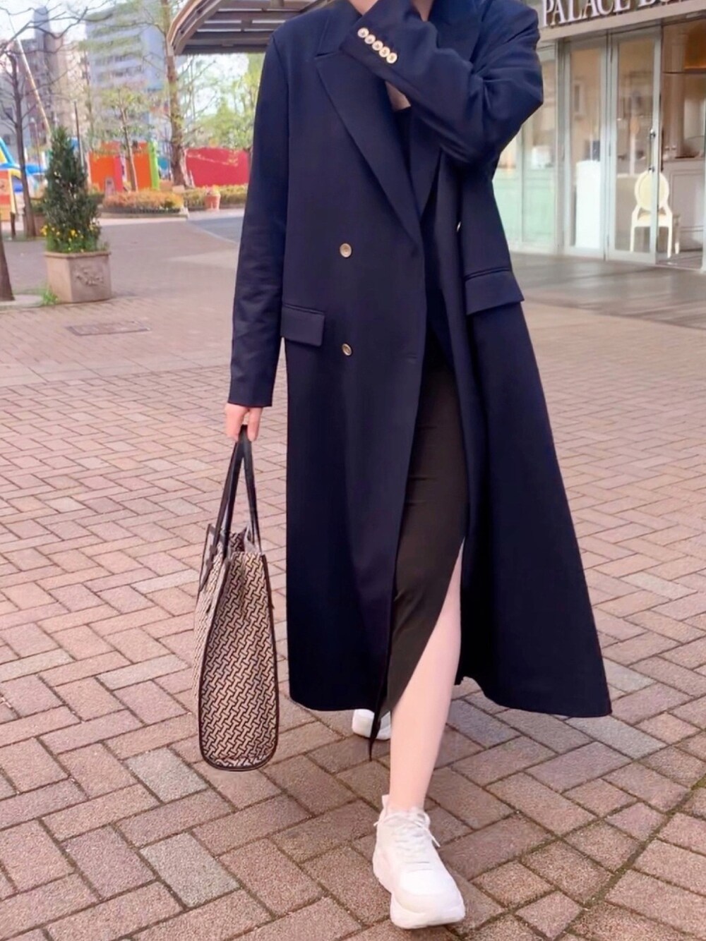 アメリのロングジャケットを主役に、ラフなルームワンピとスニーカーでカジュアルダウン。どこか力を抜いた感じのコーデが好き。