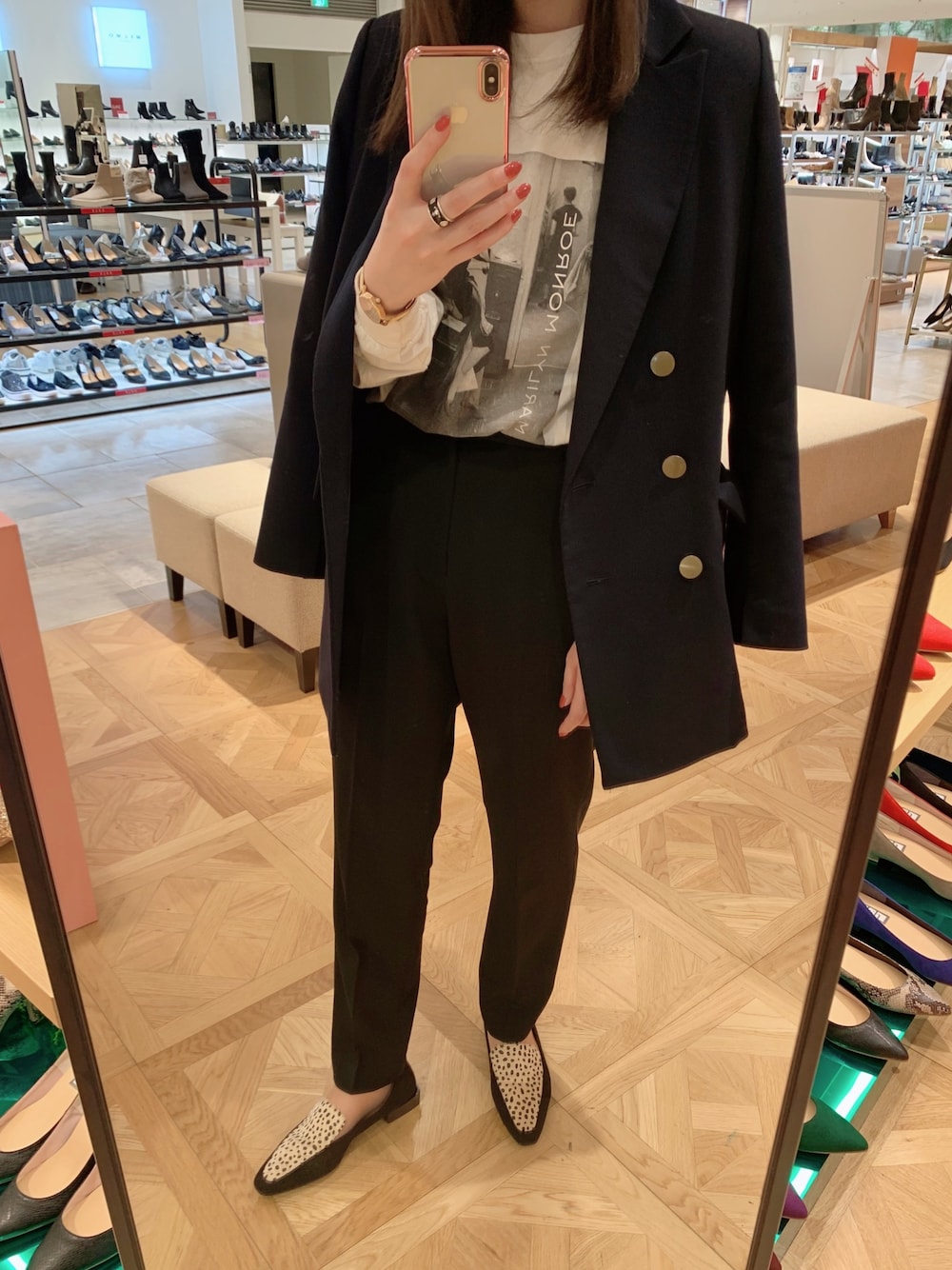 かっちりしたアイテムほどどこかはカジュアルに。中はラフなマリリンモンローロンT。