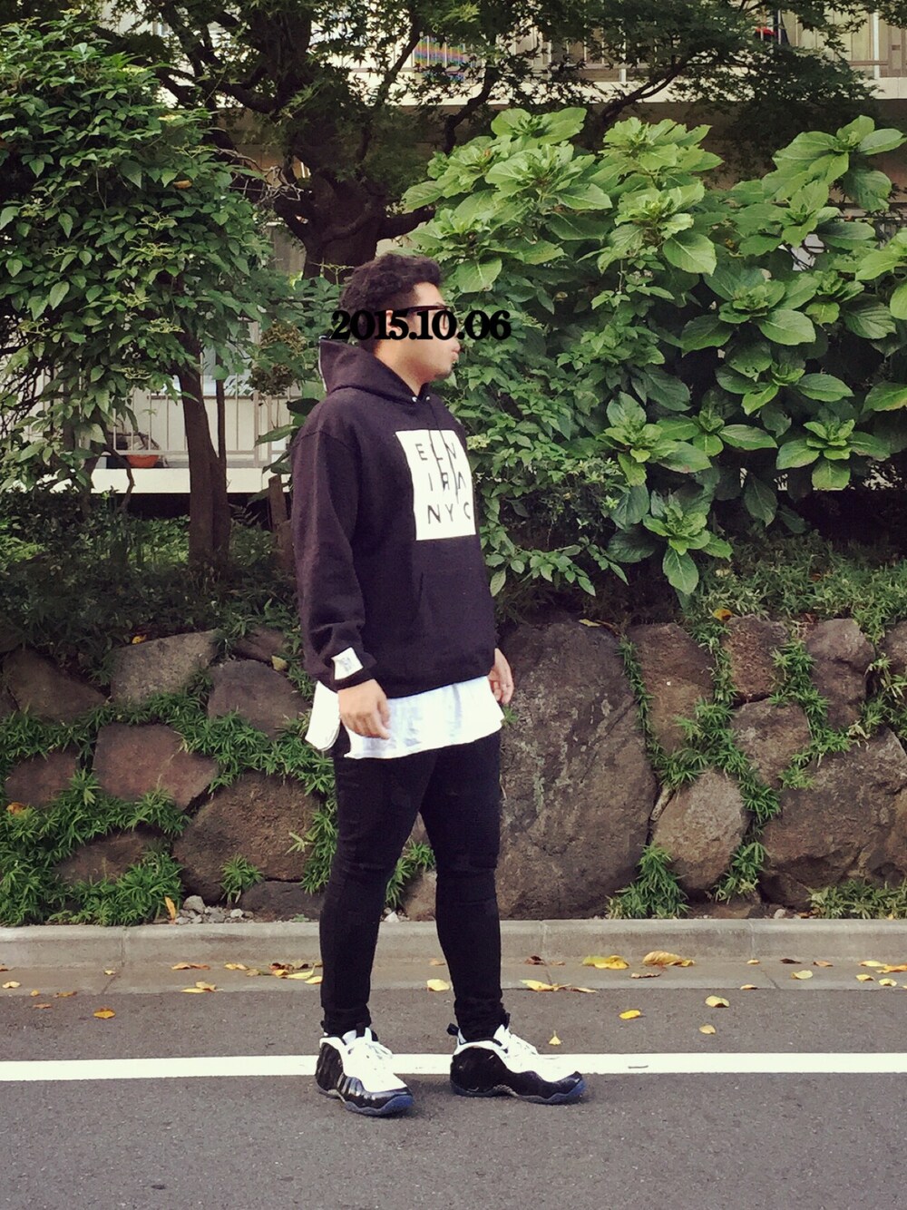 ブラック系のパーカー、ホワイト系のTシャツ/カットソー、ブラック系のスニーカーを着用したメンズの秋コーディネートの1枚目の写真