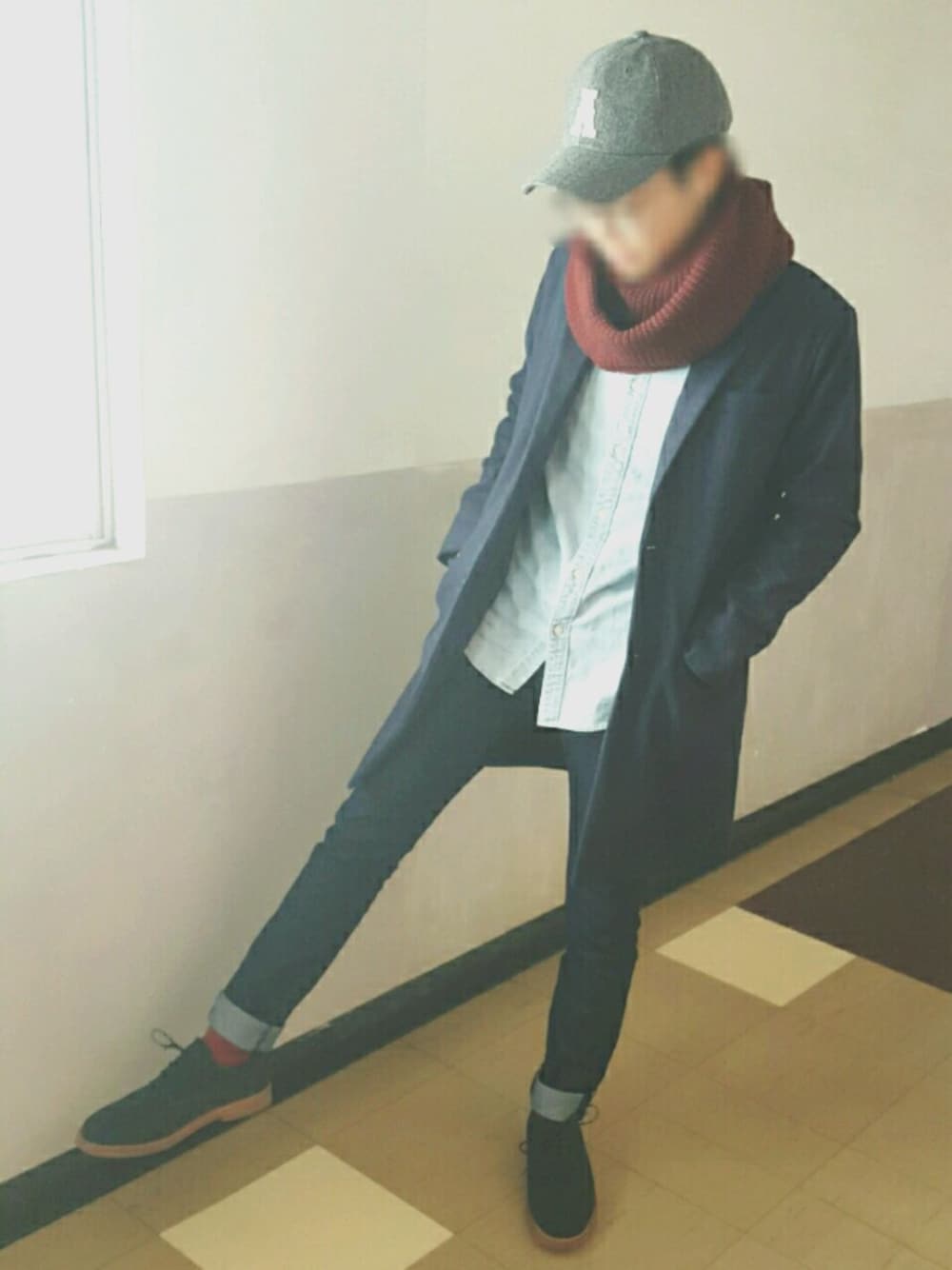 デニムシャツとスキニージーンズで綺麗めを 意識しました。 時期的には寒いのでスヌードを巻き、 まとまりを出すために同じ配色の靴下を 履きました。 靴下が目立ちすぎないように、 ロールアップを低めにして、ほんの少しの 隙間から靴下が見えるところが一番のポイントです。 ネイビーのチェスターコートはMと書いていますが、Sサイズです。 帽子はつけない方がいいと思いますが、 頭ボンバーしてるのでつけてます。笑