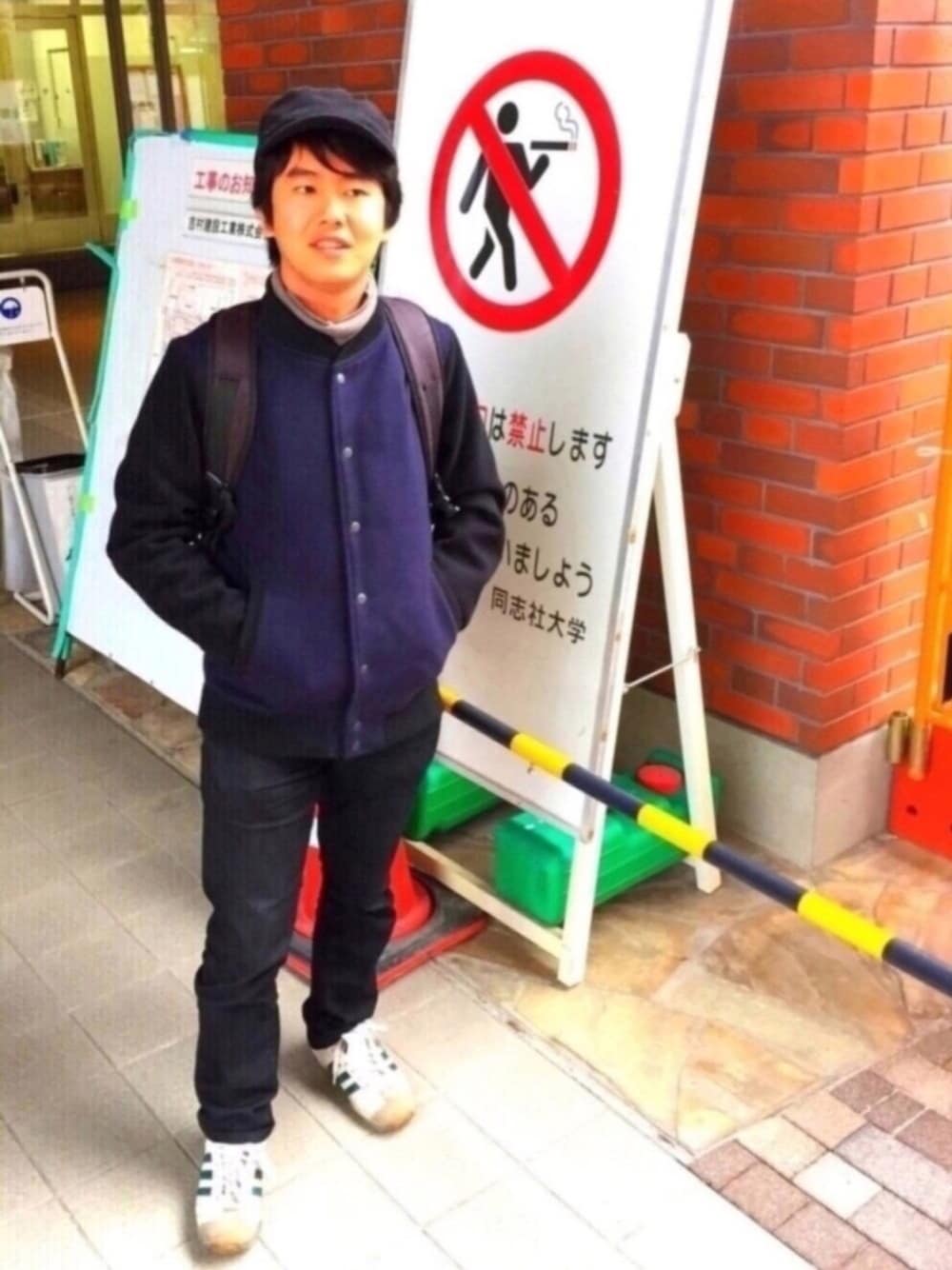 はろーです✋ 吉高屋専属モデルのリョウジとヒョロ長ノイローゼもやしです!😎💩👍🏽 いや〜早くも2月ですね✌️ 今年も楽しいことが沢山ありますように🙏 ちなみに2016年のハイライトは前頭部ごま油殺人事件です(2016/11/17)㊙️ さて、今回のコーデ。 街は静閑し、寒さの残るこの時期ぴったりのコソ泥コーデです🌲🌲 全体を黒、ネイビーといったシックな印象にまとめ、コソ泥感を出しました💚 靴は動きやすさ重視のスニーカー😈 暗めの全体に白でワンポイント♡です🚶🏿💬 また、さりげないタートルネックのインナーをチラつかせて温かさ☺️💕を出すことでマフラーいらず❗️👏 ほっぺたの異常なテカリもアクセントとなって⭕️ですね(^^)
