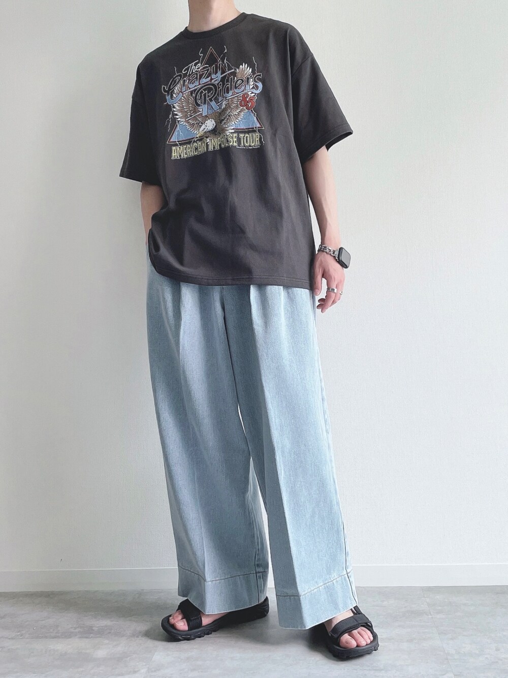 ご覧頂きありがとうございます。 今回はロックTシャツを使ったコーデ。 では👋🏻 〜〜 w e a r s i z e〜〜 ロックTシャツ Mサイズ デニムパンツ Mサイズ スポーツサンダル Mサイズ -- 最後までお読み頂きありがとうございます。