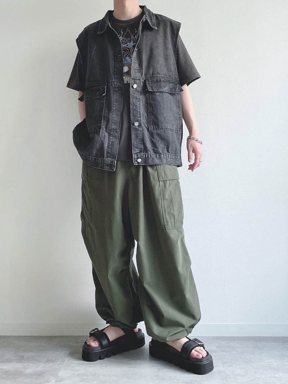 ご覧頂きありがとうございます。 今回はストリートコーデ。 では👋🏻 〜〜 w e a r s i z e〜〜 デニムベスト Mサイズ プリントTシャツ Mサイズ カーゴパンツ Mサイズ レザーサンダル Mサイズ -- 最後までお読み頂きありがとうございます。