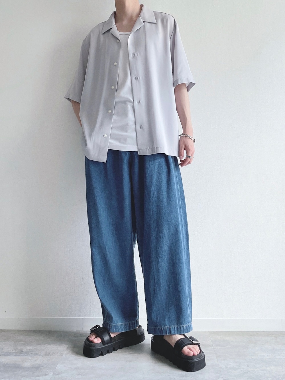 ご覧頂きありがとうございます。 今回は、きれいめカジュアル。 では👋🏻 〜〜 w e a r s i z e〜〜 開襟シャツ Mサイズ タンクトップ Mサイズ デニムパンツ Mサイズ レザーサンダル Mサイズ -- 最後までお読み頂きありがとうございます。