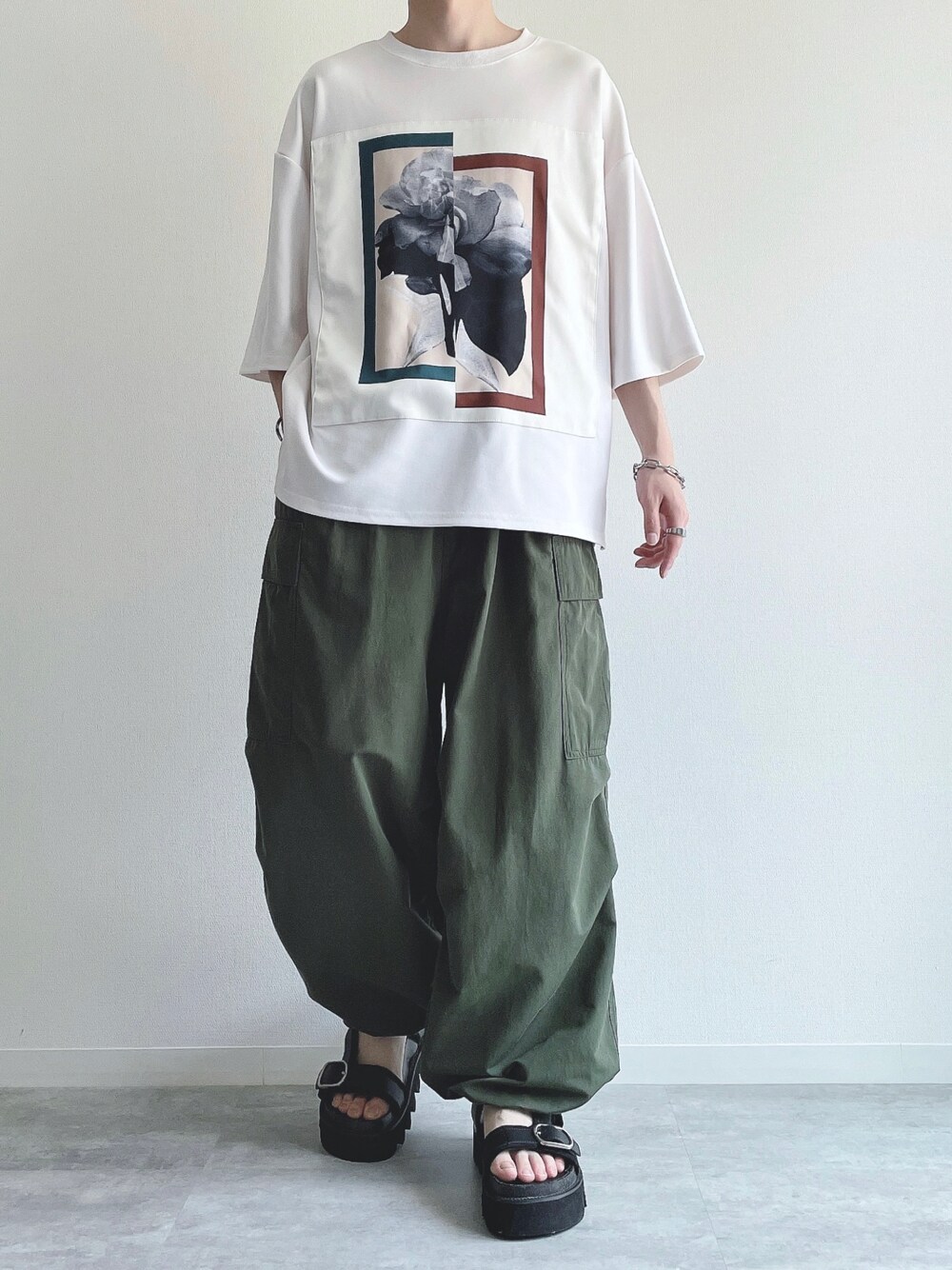 ご覧頂きありがとうございます。 今回はカーゴパンツを使ったコーデ。 では👋🏻 〜〜 w e a r s i z e〜〜 プリントTシャツ Mサイズ カーゴパンツ Mサイズ レザーサンダル Mサイズ