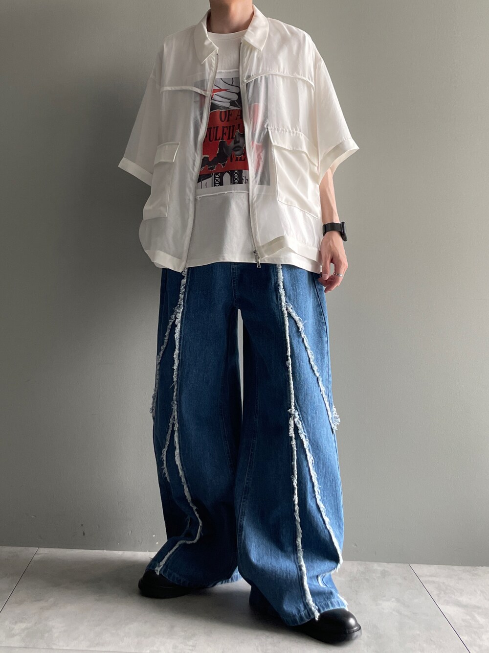 ご覧頂きありがとうございます。 今回はANEDISTのフリンジデニムを使ったコーデです。 では👋🏻 〜〜 w e a r s i z e〜〜 シアーシャツ Mサイズ プリントTシャツ Mサイズ フリンジデニムパンツ Mサイズ 革靴 Mサイズ -- 最後までお読み頂きありがとうございます。