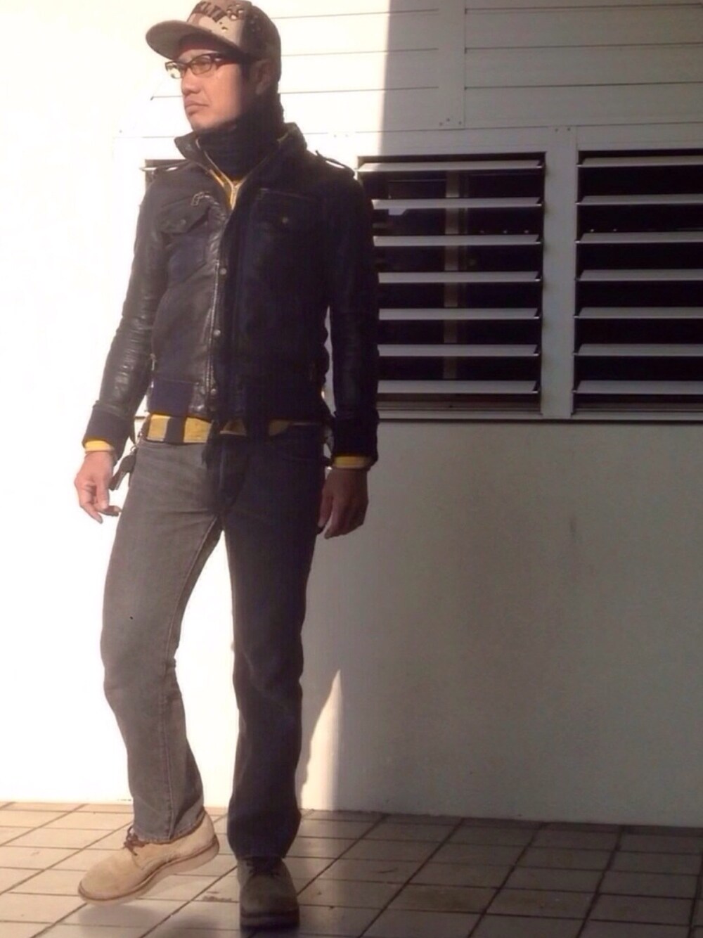ネルシャツ裾出し、またやってる。 もともとTシャツ一枚で着てジャストサイズのレザージャケット。 サーマル着てネルシャツ着て、もうパンパン。 でもおかげで防寒はバッチリ。さらにネックゲイターで風の侵入を防げば、パーフェクト。 ちなみにこのネックゲイター、もとはマフラーだったものを半分に切って縫い合わせた自作アイテム。 けっこう重宝してます。マフラーに飽きたらお試しを…って、貧乏くさいかな?