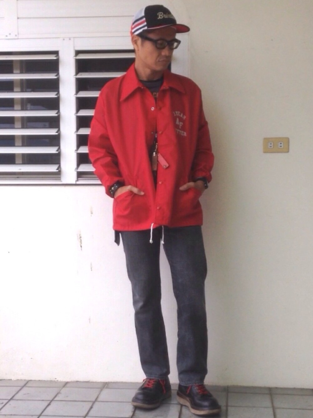 きのうに続きコーチジャケットとメッシュキャップのコーディネート。 きょうは赤バージョン。
