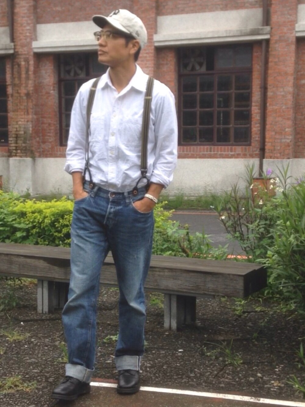 白シャツにサスペンダー。 リネンキャップにウォッシュドデニム。 洗いざらしコーデ。