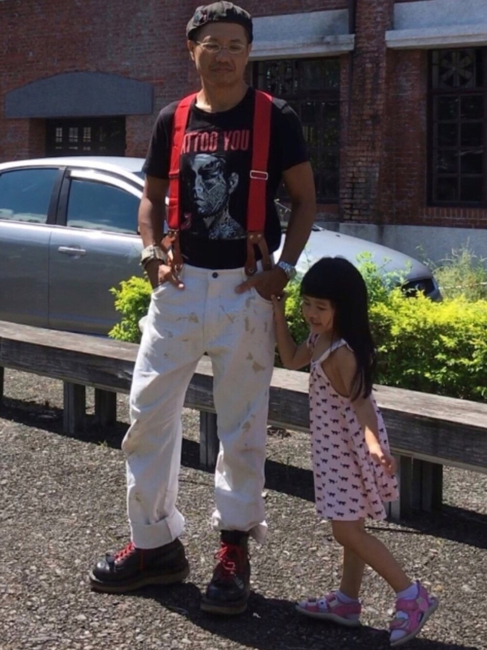 モノトーンに赤でアクセントを。 娘はいつものお下がり。 今日の彼女のチョイスは、最近お気に入りのネコちゃんの総柄ワンピース。