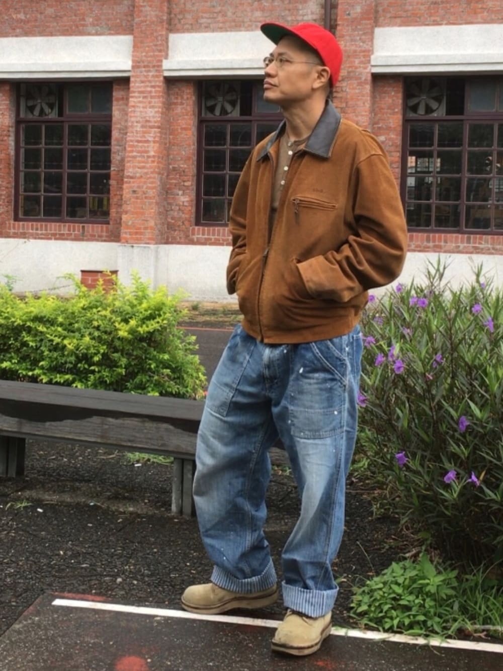 今朝は涼しい。 季節が一気に一ヶ月ぐらい進んだ感じ。 ブラウン系スエードのアウターとブーツ 色落ちデニムと合わせて。 赤のウールキャップでアクセント。 全体にルーズシルエットで。