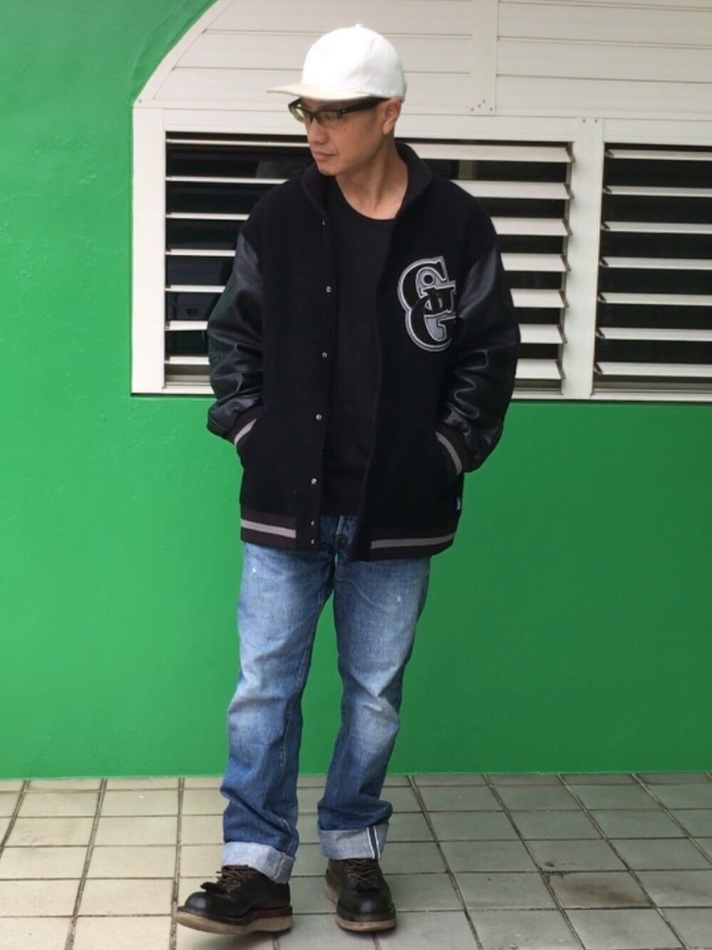 黒のスタジャンと白のレザーキャップ。 存在感のあるアイテムなので、小細工なし。直球勝負。