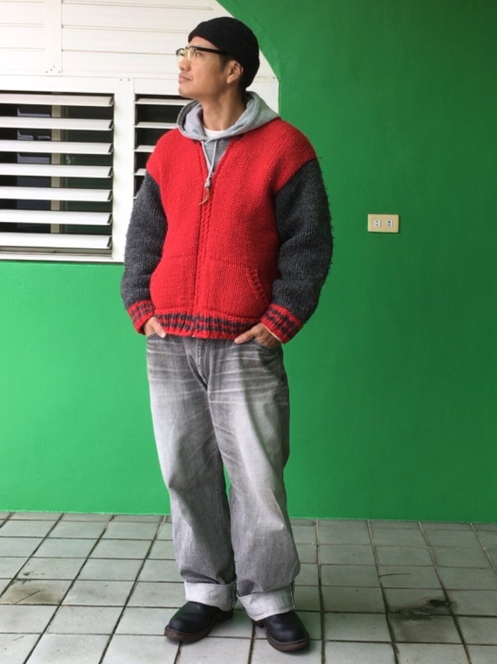 GAIJIN MADE のカウチンセーター。 聖林公司が展開するブランドの一つ。 ハリウッドランチマーケットとか BLUE BLUE とかの。 こう見えてちゃんとカナダ製。 ずっしりとしたウールが空気を含んでポッカポカに。 古着の掘り出し物で、500円もしなかったんですけどね。 少し汚れがあったくらいで、ホツレも虫食いもなし。 一生着られます。 肩が落ちたかなりのルーズシルエットなので、ボトムスもワイドなのを合わせて。 だらしなくなりすぎないように黒のビーニーとエンジニアブーツで引き締め。