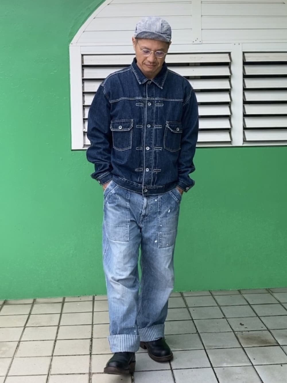 インディゴブルーのグラデーション。 ビッグシルエットで。 NEW YORK HAT のヒッコリーワークキャップ。 正しくは Engineer cap 。短めのツバ。まっすぐ伸ばしても、上に跳ね上げてもサマになる。 ホント好きだわ。 IG▷gotacarkey