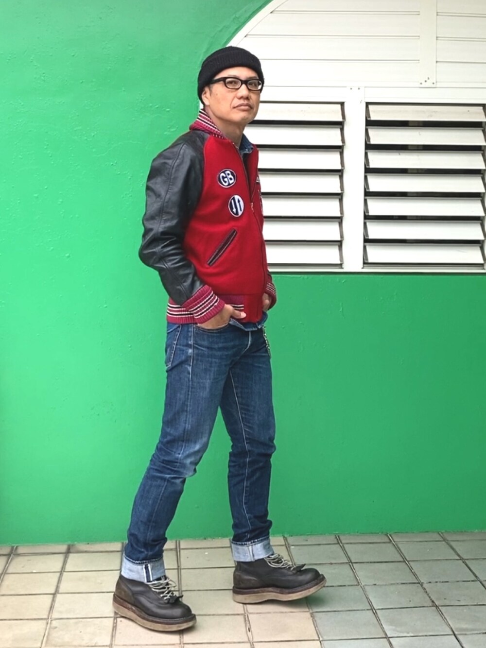 ORTHのスタジャン「SKOOKUM 'Stadium Jacket RED×BLK'」を使ったコーディネート