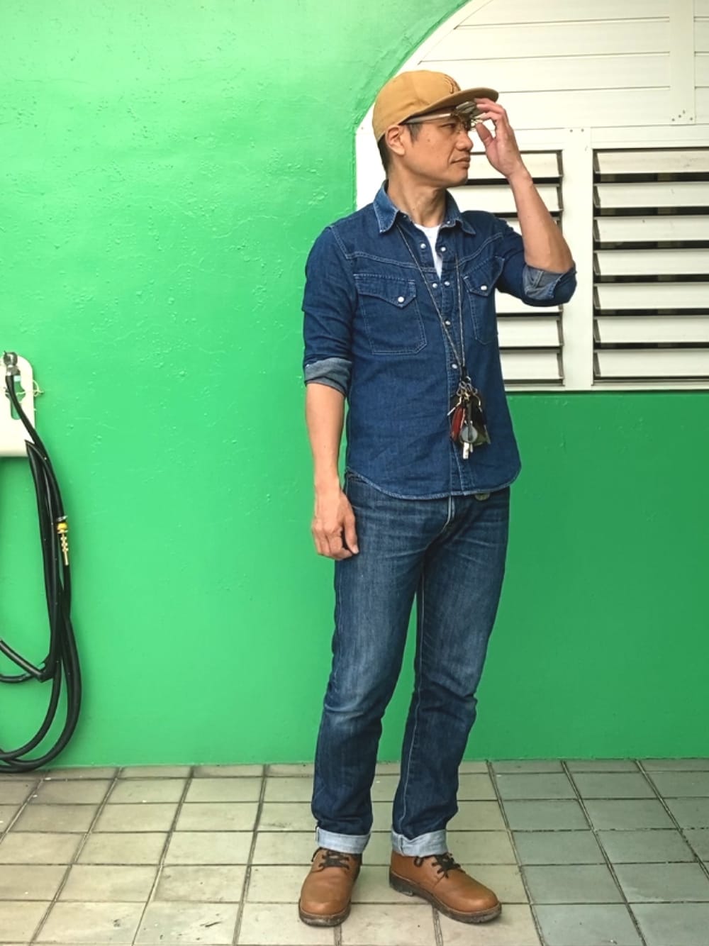 デニム上下。 フリップアップのメガネ👓は老眼には至極便利。 IG▷gotacarkey