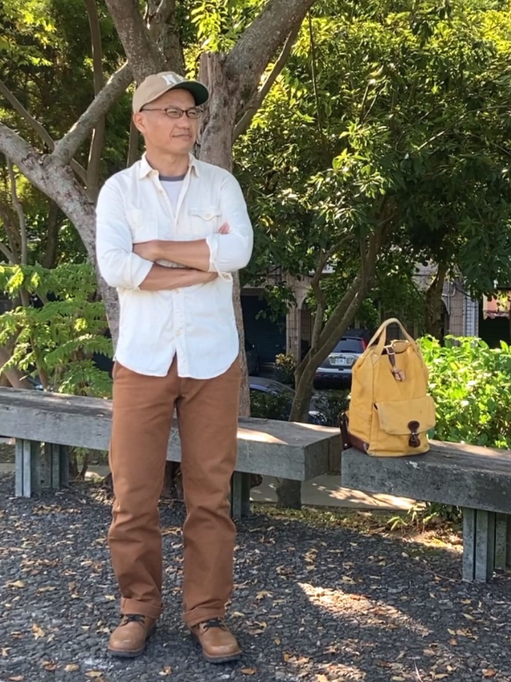 生成りのシャツを少しアウトドアテイストで。 今日はブラウン系のグラデーション。 IG▷gotacarkey