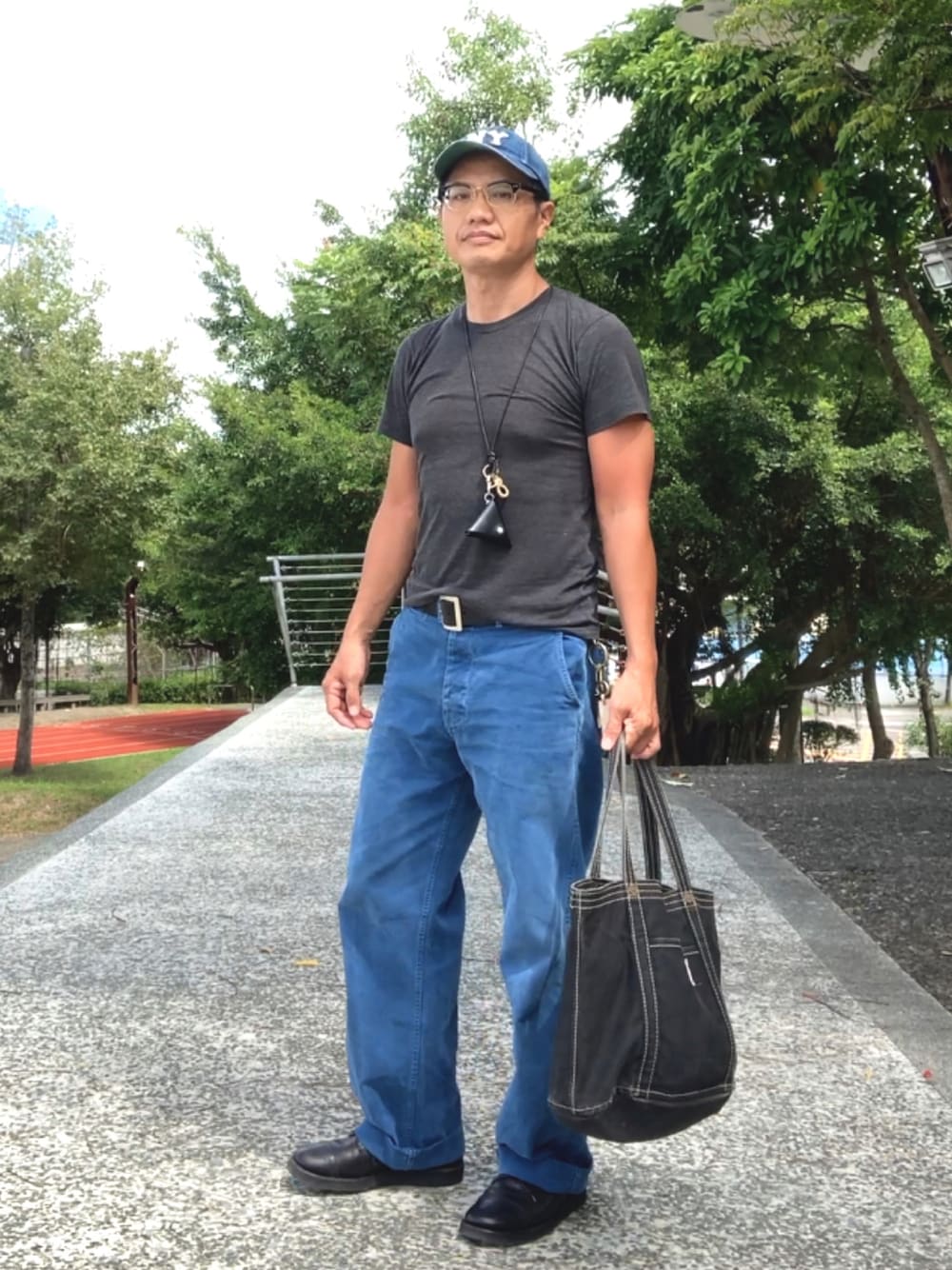 Tシャツ1枚。 チノパンに合わせてブルー系で。 かれこれ20年選手の一澤バッグ。 まだまだ使います。 IG▷gotacarkey