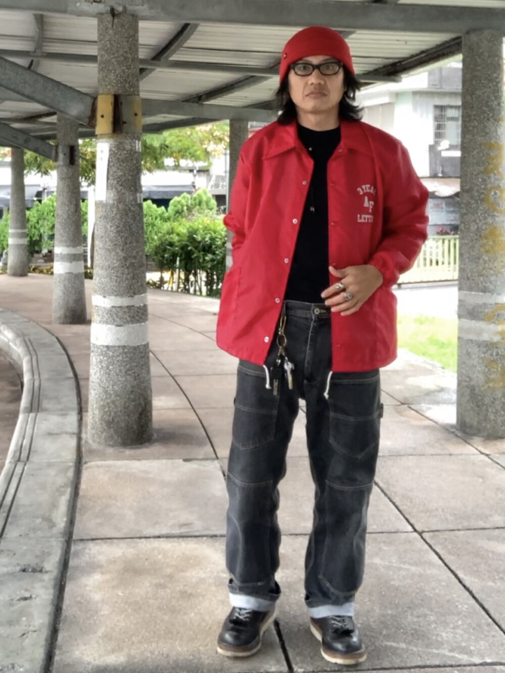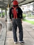 赤のビーニー、赤の極太サスペンダー、赤のコーチジャケット。 他は黒で。 IG▷gotacarkey