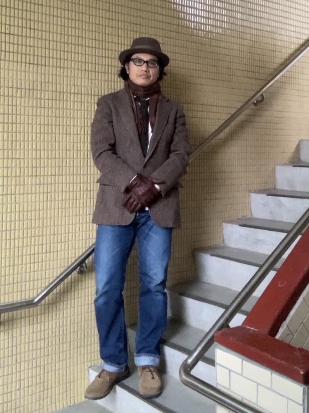 ツイードジャケットにウールタイ。 カシミアのマフラー。 フェルトハット。 スエードのチャッカブーツ。 ブラウングラデーションにインディゴブルーでアクセント。 IG▷gotacarkey