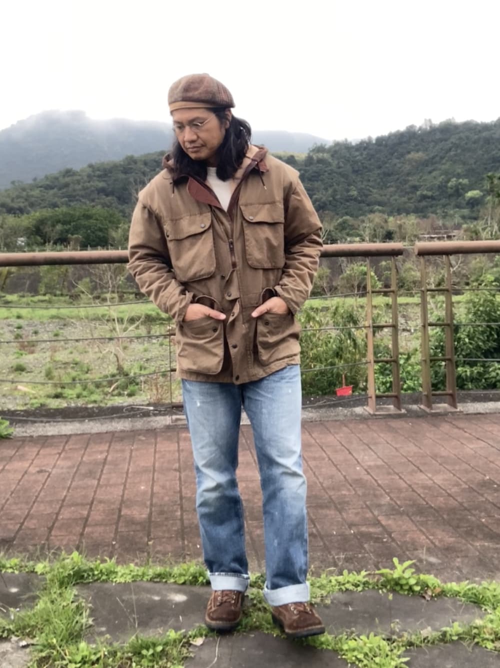 クレイジーパターンのツイードキャスケット、アメリカ🇺🇸製。 オイルドクロスのハンティングジャケット、オーストラリア🇦🇺製。 マウンテンブーツはイタリア製。🇮🇹 セルビッジデニムのビンテージ加工ジーンズ、日本製🇯🇵。 全部格安古着。 C製、V製が多い最近の服はあまり着る気がしない。