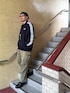 レザーのベレー帽を後ろ被りにして、足元は同色レザーのカントリーブーツ。 スポーツとミリタリー をレザーアイテムで味付け。