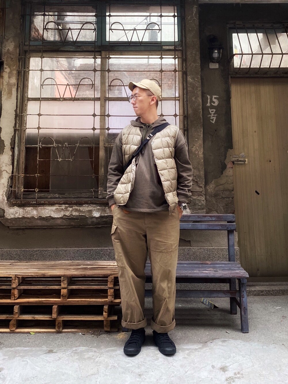 Darren huangのダウンベスト「[TAION/タイオン] Vネックボタンインナーダウンベスト」を使ったコーディネート