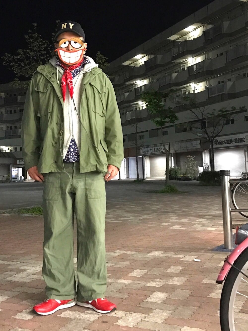 セットアップではないのですが、たまたま同色だったので、セットアップ風にしてみました。 サバゲー帰りに見られないように、赤スニーカー、赤バンダナに花柄シャツを入れました。