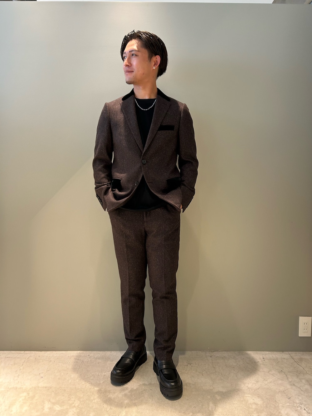 ベルベット切替がデザインアクセントとなるジャケットとスラックスのセットアップコーディネート。 適度にウェストをシェイプさせ、着用時のシルエットを綺麗に見せてくれます! 華やかでドレッシーな印象なので、ディナーやパーティの時にもおすすめです!