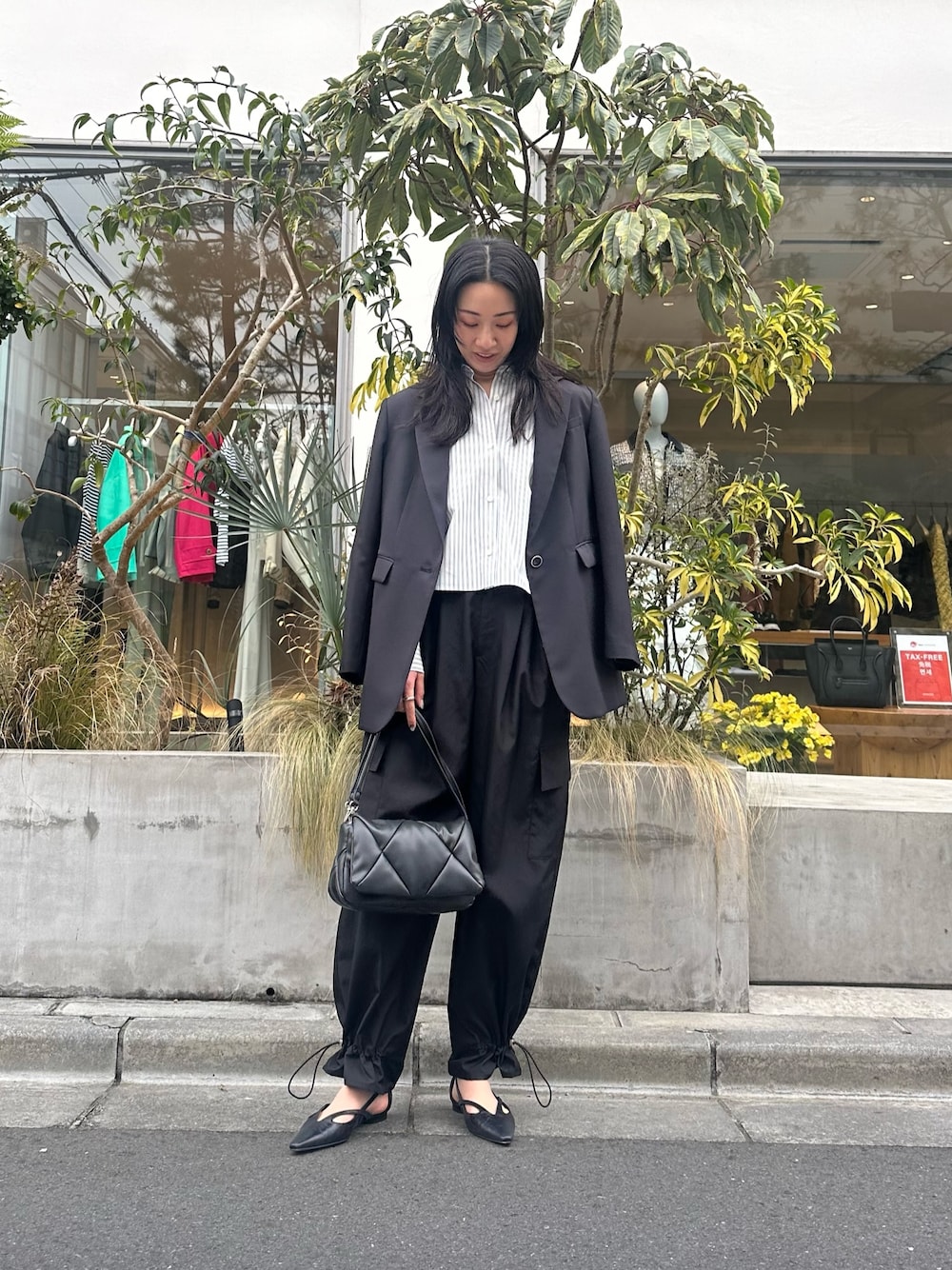 トレンドのジャケットコーディネートは、ブラックでモード感を、カーゴパンツで抜け感を出してまとめました! シャツの肩は開閉調整ができます!