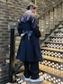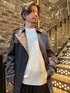 オンオフ使えるトレンチコート。 グレーとネイビーの2色の配色がモダンな印象で、撥水素材を使用しています。