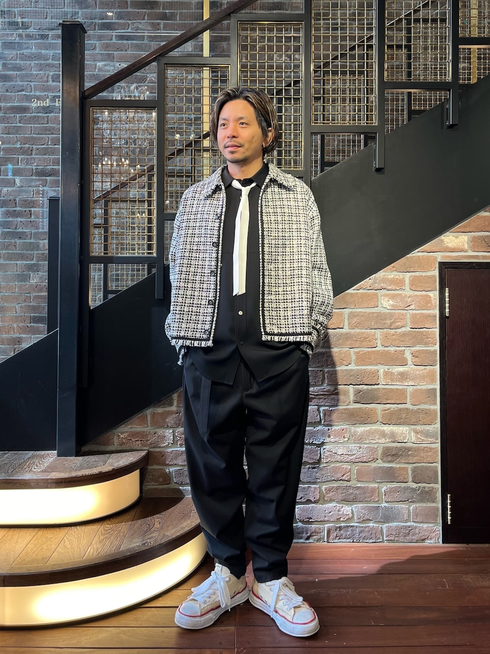 着丈が短いツイード生地のブルゾンに、インナーとボトムをブラックで合わせたコーデ。