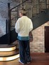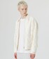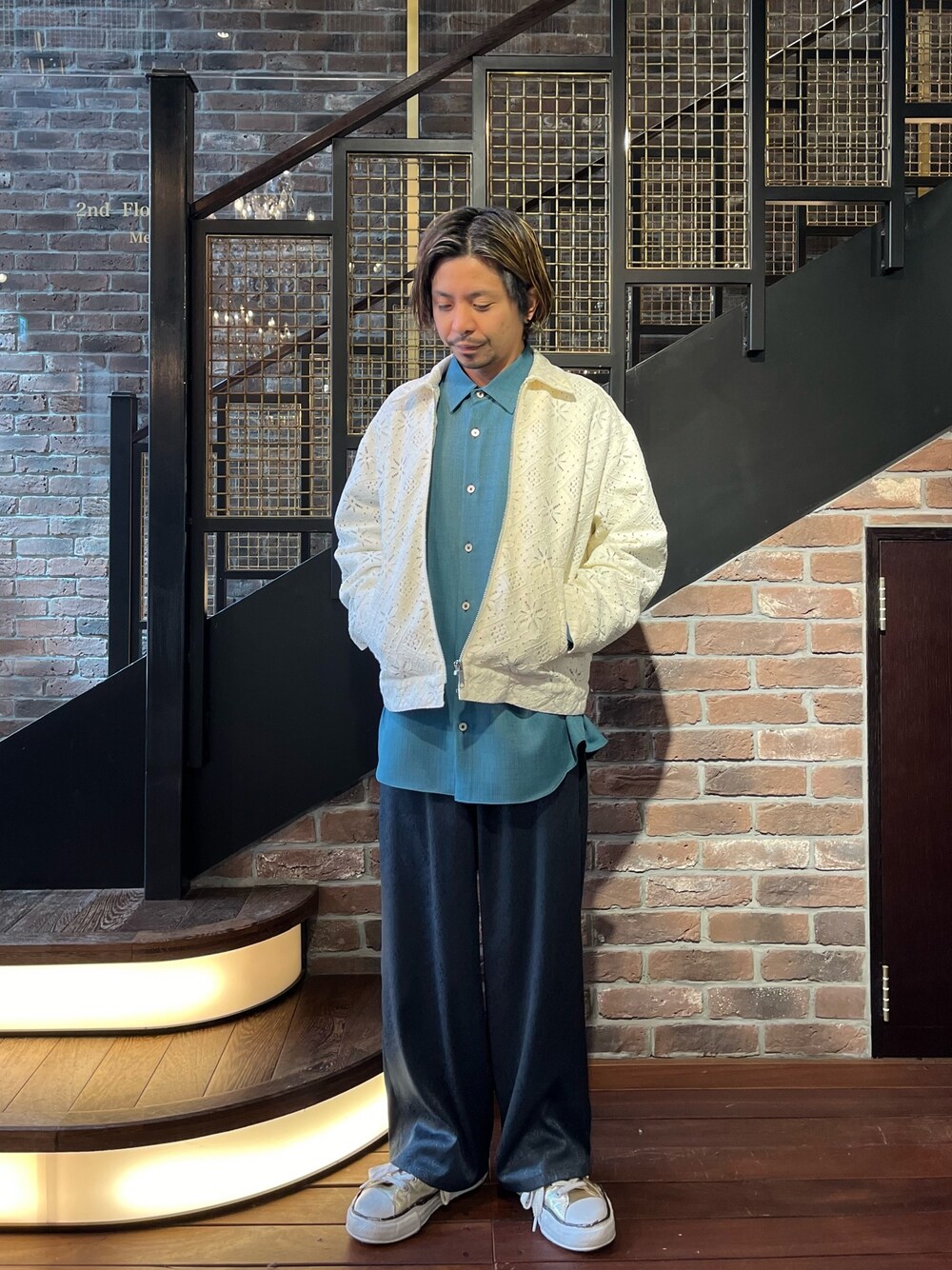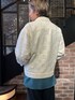 レース生地を使用した白のアウターにグリーンのインナーを合わせたコーデ。 アウターのシルエットはゆったりしており、裏地を使用することで脱着しやすくなっています。