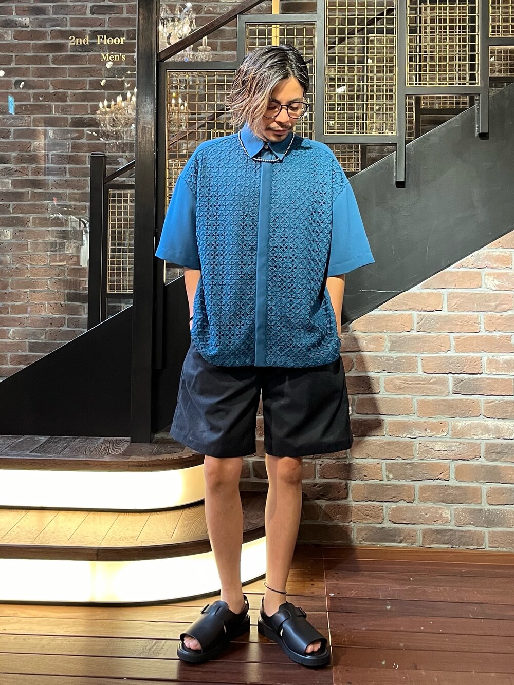 半袖シャツ、ショートパンツ、サンダルと真夏に涼しく着用できるコーデです。 レースが特徴のシャツは色物、サンダルはレザーで大人カジュアルにまとめました。 シャツはシワになりにくい素材で、ビッグシルエットなので風通しが良いです!