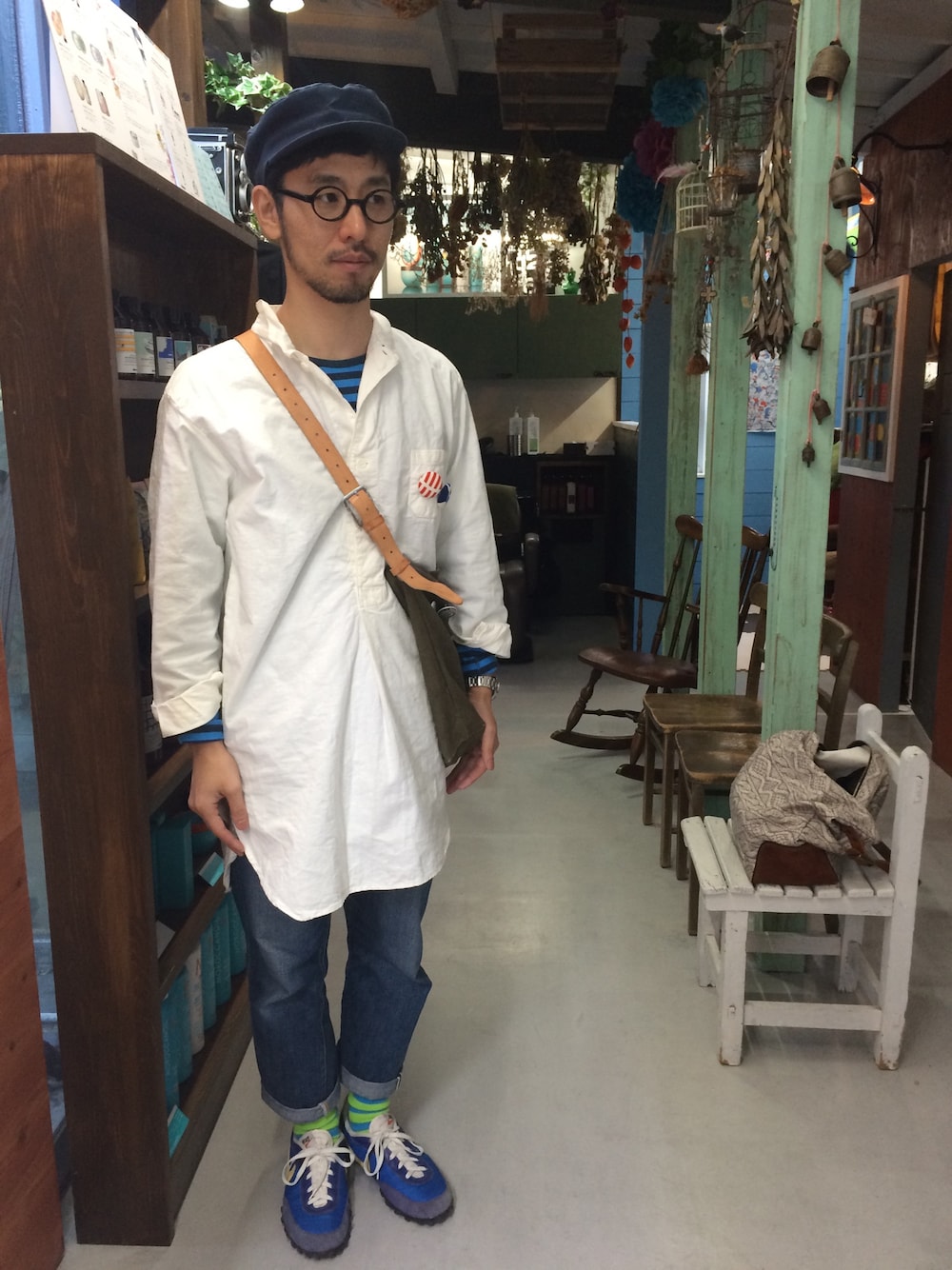 フランスヴィンテージのグランドファザーシャツに薄いデニムを合わせて春っぽく 田舎のおじいちゃんが着てるイメージからその名がついたみたいです(*´罒`*) ワッフルレーサーとのヴィンテージ感の相性も◎