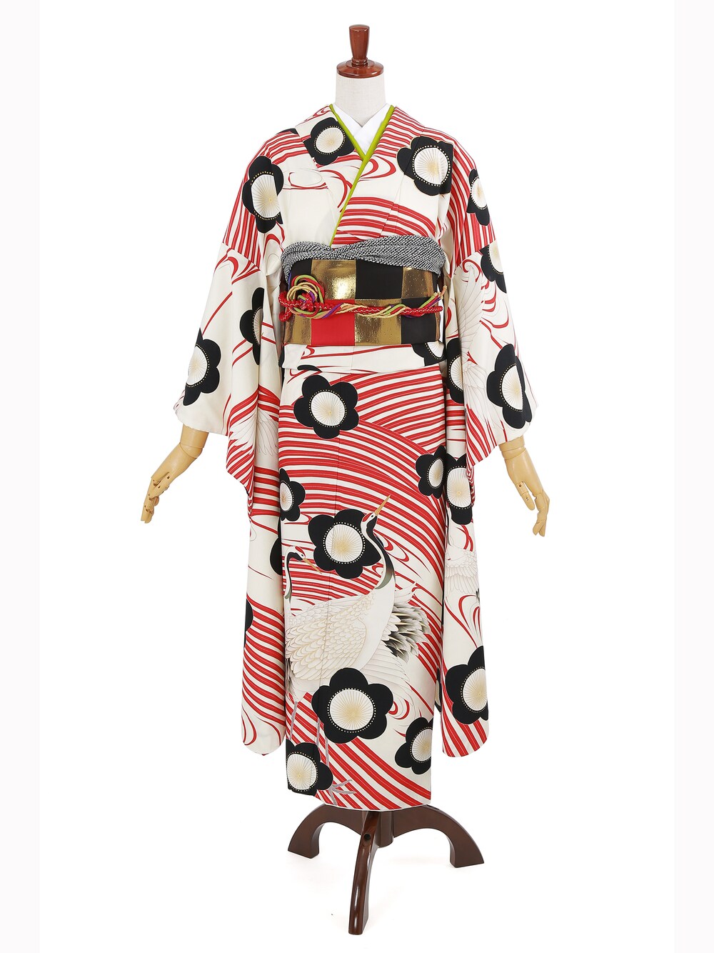 白地に赤い波と黒の梅が奇抜な雰囲気のきもの道楽の振袖です。 配色は個性的ですが、波と梅と鶴の古典柄。 クラシカルとモダンの融合が新しい1枚、色数を増やさないすっきりコーディネートに重ね衿の鶯色でアクセントを。 ※帯・小物は全てオプションです。 キモノグラース並木通り店 〒730ー0029広島県広島市中区三川町4ー13竹田ビル TEL 082ー545ー0355 open 11:00~20:00 定休日 水曜日 http://kimono-grace.com/