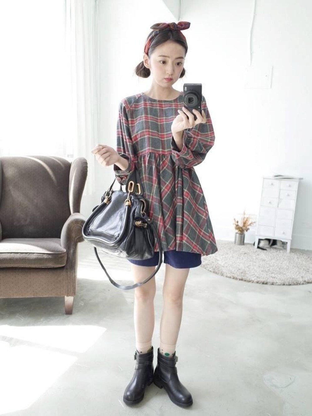 簡婕真的是超有自己個性的女孩 他穿什麼衣服都可以變得好有自己的味道 本來甜美的格子洋裝與格子髮帶 簡單搭了一件短褲 短靴 跟露出可愛的襪子 整體就變成超級簡婕STYLE