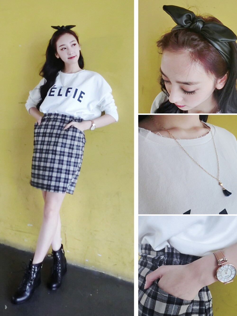 字母上衣X復古格紋窄裙X個性拉鍊軍靴 展現個性甜美學院風style