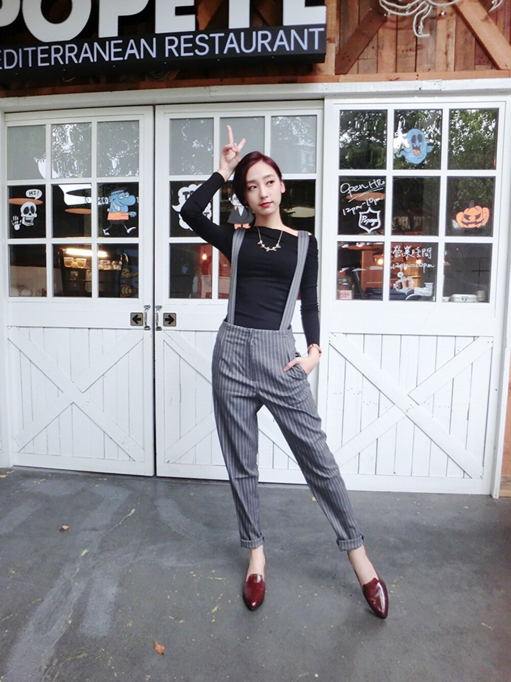Gracegiftのサロペット/オーバーオール「俐落個性 韓國直條紋兩穿吊帶褲」を使ったコーディネート