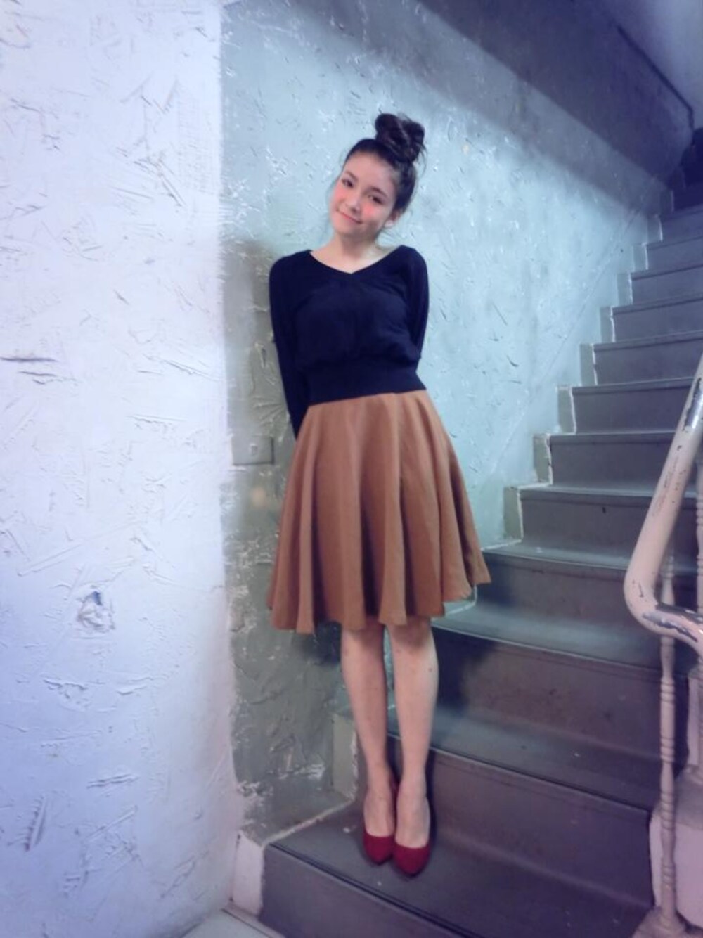 簡單的短版針織上衣+復古雪紡及膝裙 再穿上亮眼紅色細跟高跟鞋,展現優雅甜美的風格~~