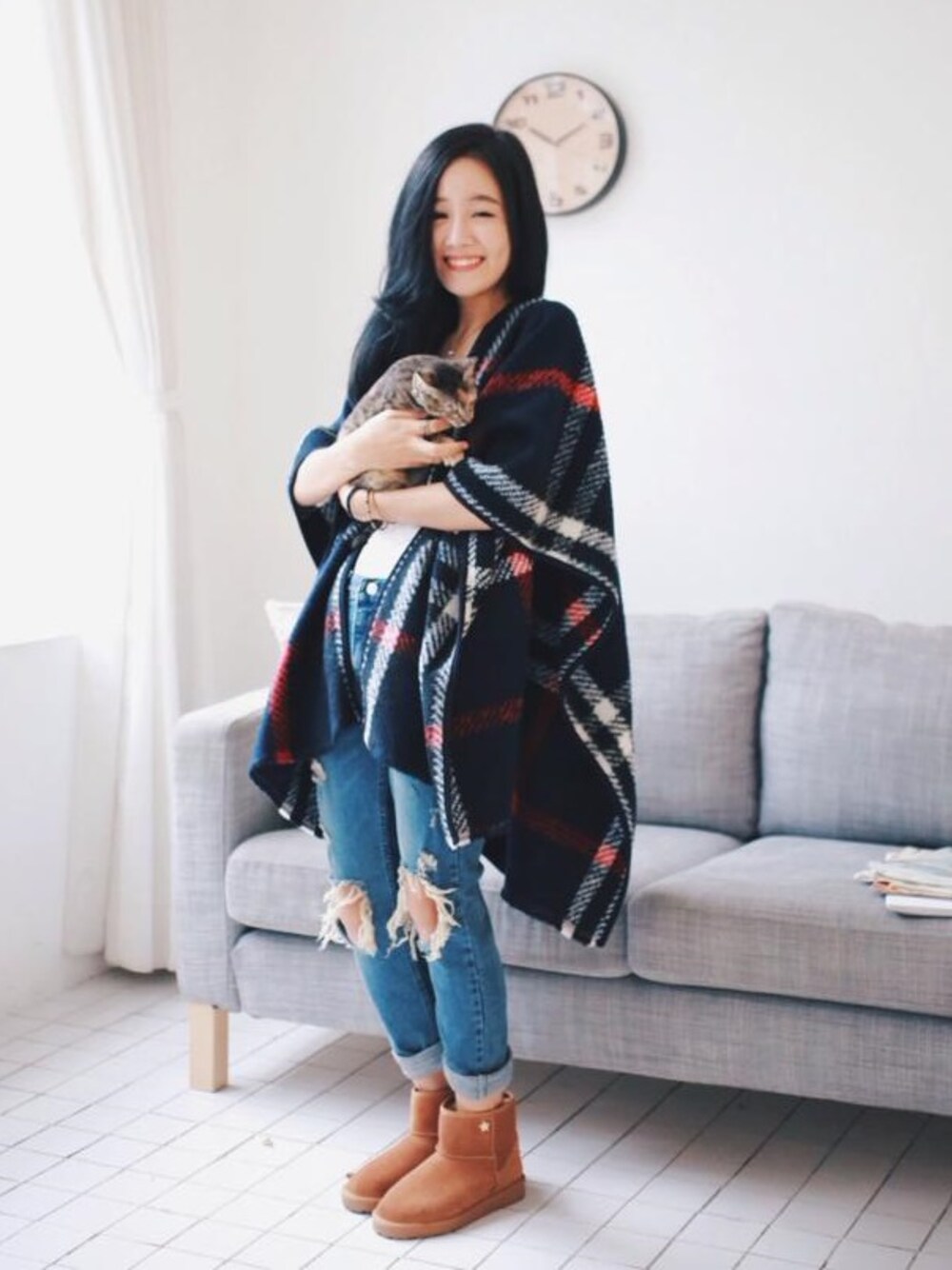率性毛呢格紋披肩圍巾X 有型的破損牛仔褲 再搭配別具巧思的kikilala 聯名雪靴 營造出隨性休閒又不失甜美的風格♥♥♥