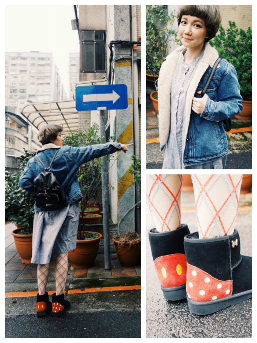 一向對穿搭很有想法的 Kiki 這次穿上時髦百搭的牛仔外套 裡面鋪有軟綿綿的羊羔毛 很暖和唷!! 不管是搭配裙裝還是褲裝都超有型der~ 再搭配可愛到爆炸的米奇米妮雪靴和 閃亮亮米奇金屬飾扣的後背包 整個街頭玩味感十足呢!!