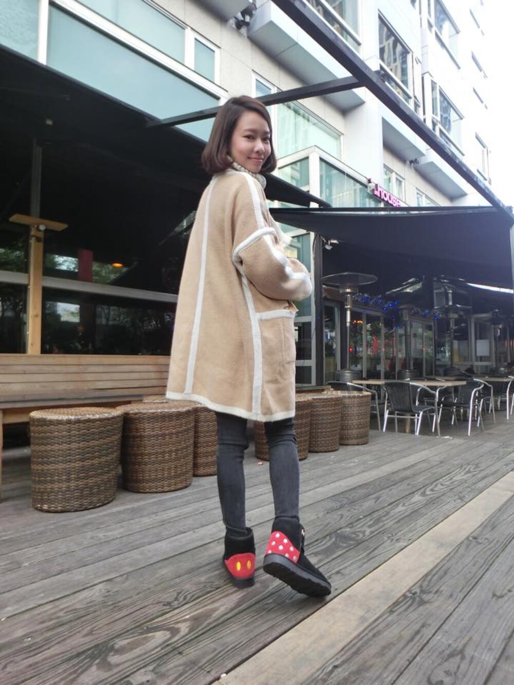 俏皮可愛的女孩兒 最適合可愛的雪靴 這次的迪士尼雪靴 隨意穿都好搭 像Cindy用今年超流行 較成熟感的大翻領毛料開襟外套 搭配可愛米奇雪靴 也拚撞出小女人的微微甜美感唷