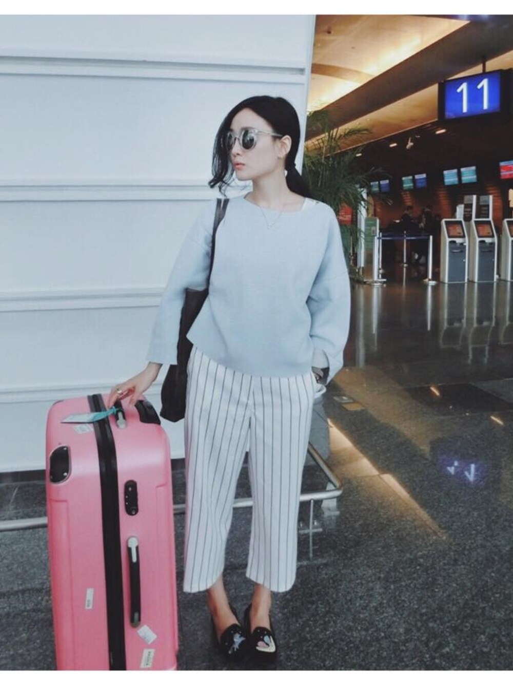 出國玩就是要穿得輕鬆但不隨便 大饅著用的粉嫩色上衣質料超好 穿起來很舒適 搭配超夯的直條紋小寬褲 走起來不會卡卡的 又很透氣 搭起來也是時尚人士