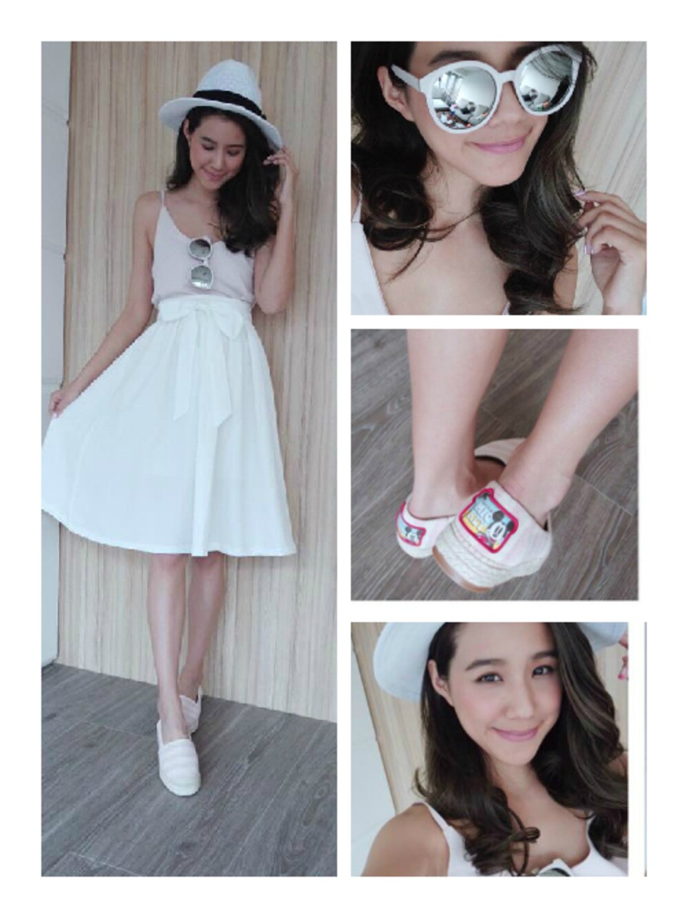 安寶也太女神惹 粉色系肩帶上衣 搭配蝴蝶結傘裙 好漂亮 米奇粉色橫條紋草編樂福鞋 與粉嫩上衣相呼應 更讓整體多了一份悠閒感