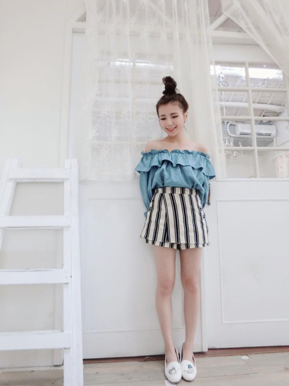 培培 Peipei 輕甜美穿搭 培培今天太可愛惹 浪漫性感又微微可愛的平口上衣 露出美美的鎖骨 再用直條紋褲裙中和一下女孩感 穿上cb內增高樂福鞋 用小心機拉長腿部線條跟整體比例 整個人十足可愛>////<