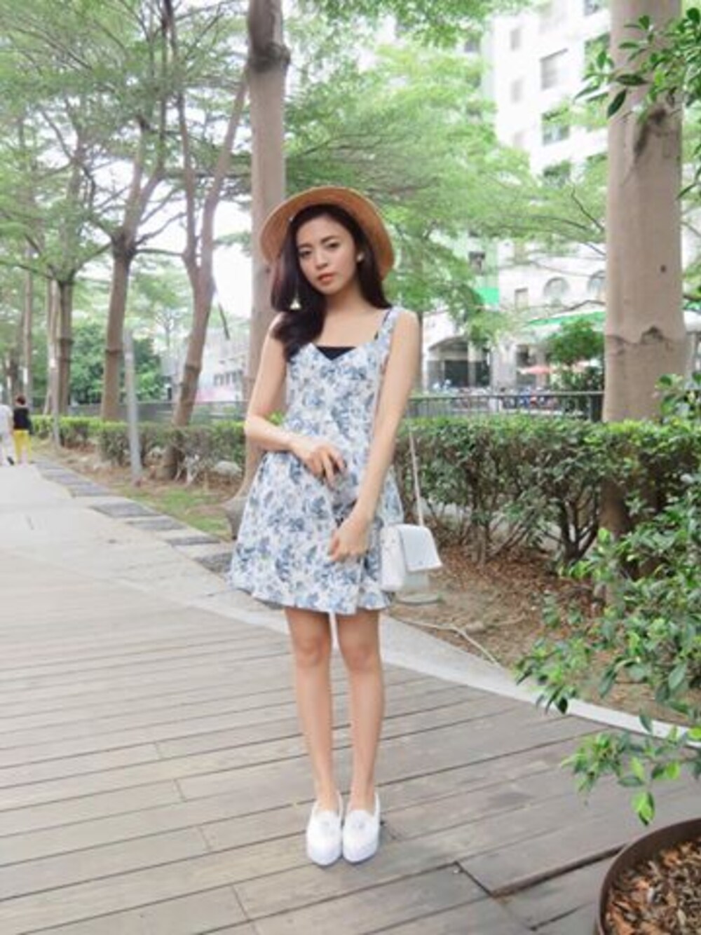 初夏甜美女孩 蔣蔣 蔣蔣穿上浪漫無比的印花洋裝 配上清甜午茶系列的CB尖頭厚底休閒鞋 夏日沁涼微甜感展漏無遺