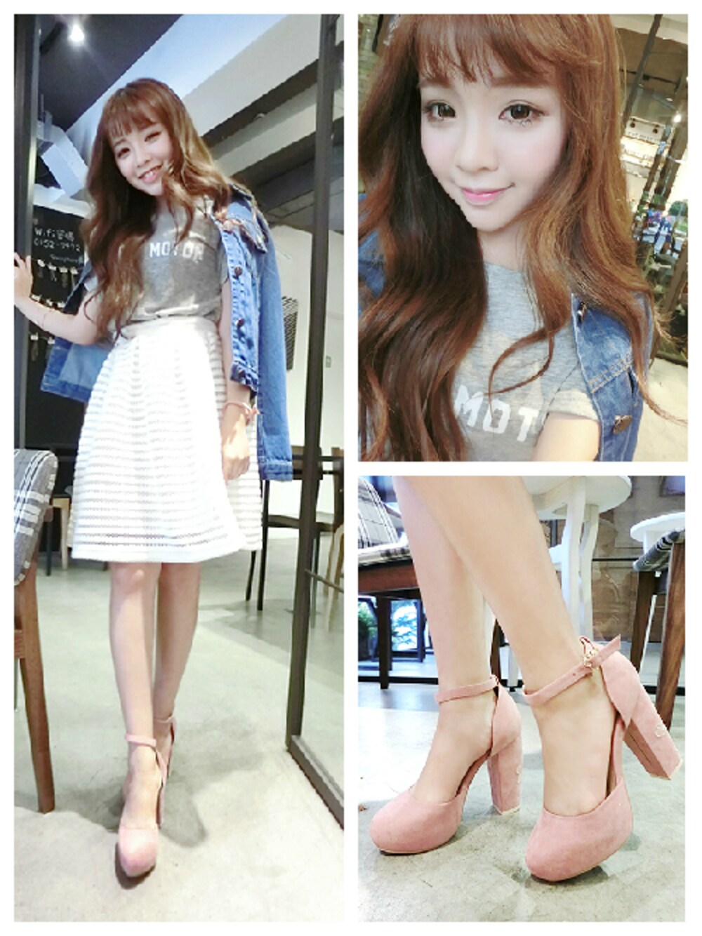 氣質及膝傘裙look 氣質滿點的及膝傘裙 搭配粉色系繞踝跟鞋 增添女孩氣息外 最重要的是可以拉長比例 才不會因為穿上及膝裙而看起來短短的 外面搭配牛仔外套 降低太過成熟性感的氛圍