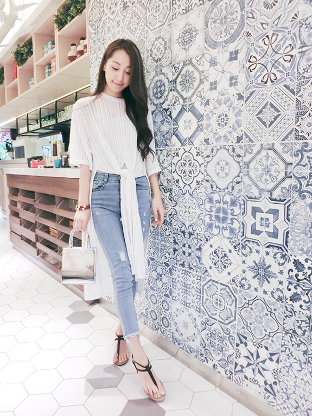 Treeny 純純 一個人的午茶look 有時候會沒來由地想自己一個人獨處 悠哉地逛逛百貨公司 輕鬆的吃個甜甜下午茶 舒適的涼鞋 搭配牛仔褲 輕鬆又寫意 搭配特殊設計的下擺開岔綁結罩衫 整體造型超亮眼!!! 隨意拎個金屬色系小包包 裝個手機錢包就可以出門囉
