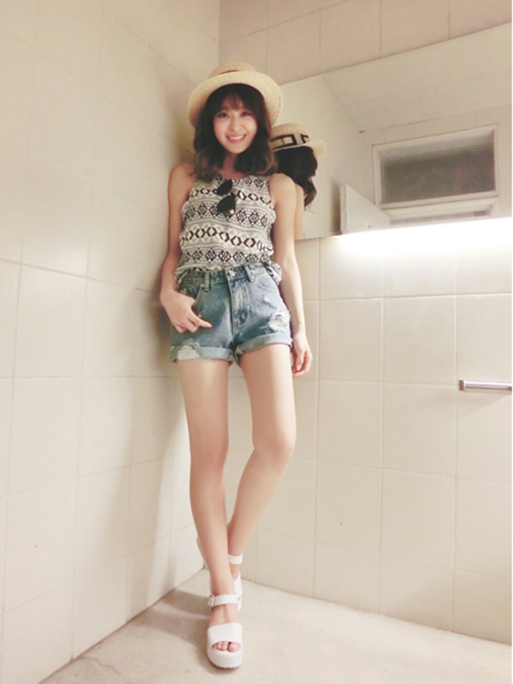 薛妞妞 夏日度假Look 圖騰印花上衣X破損短褲 簡單配上草帽與厚底涼鞋 輕鬆營造休閒度假感♡♡♡
